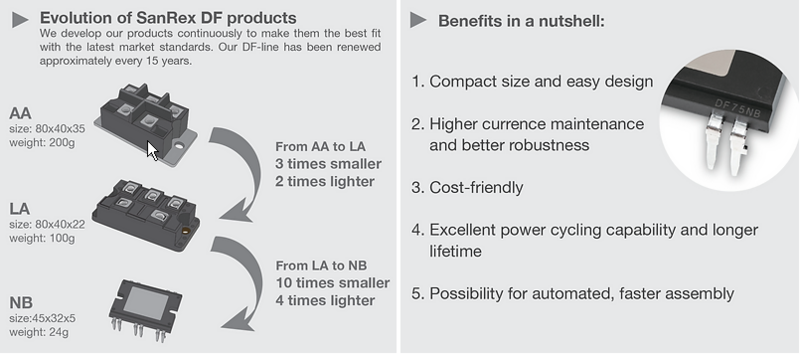 One of the diode's biggest benefits is its compact size that is perfect for products that require production-friendly and easy design. Unlike a conventional DI-package, DF-NB module has two narrow pins that enable maintaining higher current and great robustness. The drastic downsizing of the parts has also allowed the overall reduction of cost and accordingly, makes it a cheaper option compared to a normal power module.